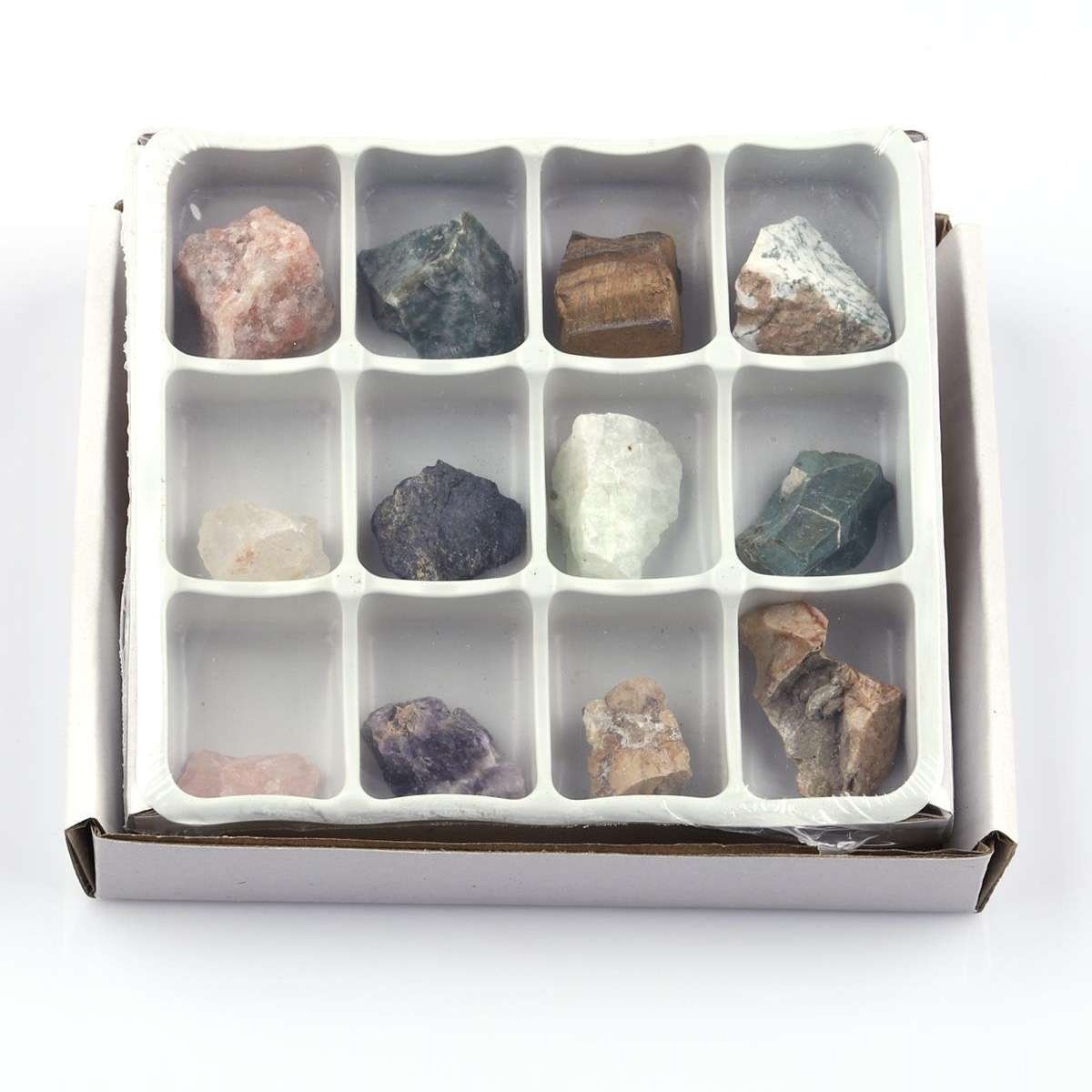 Az ásvány készlet 12 követ tartalmaz: – rózsakvarc – kvarc – napkő – ametiszt – fekete turmalin – vérkő – sárga kobra jáspis – amazonit – tigrisszem – jáspis – indiai türkiz – achát